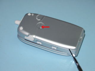 | まず、バッテリーのカバーを外します。 両面テープで固定されています。 最初は傷をつけないように マイナスの精密ドライバーの 細いものを写真の位置に差し込み カバー浮かせます。 矢印側は、つめがあるので 無理にこじると割れてしまいます。 |