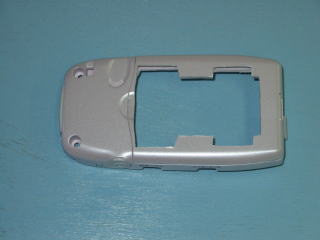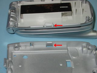 | いよいよ、工作の開始です。 幅は約25ミリ、長さは約50ミリの 開口部を作成します。 現物を合わせてみて、少しずつ カッター等で切り取ります。 前後位置はバッテリーカバーの 取り付け等を考慮して 行ってください。 中心線を書いてから始めると 左右のバランスが取れます。 |