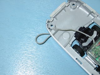 ストラップの取り付け部に 小さな穴を開けて アンテナを外に出しています。 若干感度が上がります。 |