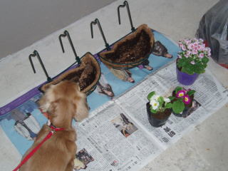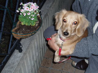 お散歩に行こうと思ったら 奥様がハンギングの お花を植え替えていました 興味津々のミルクです♪ |