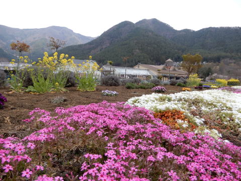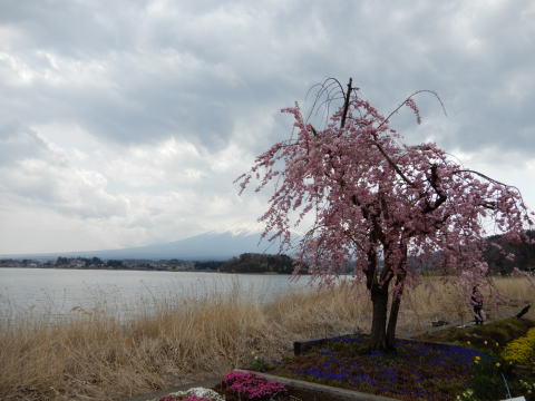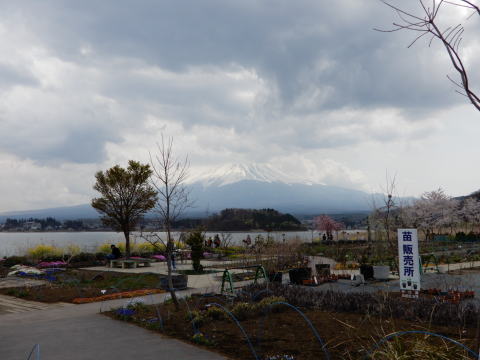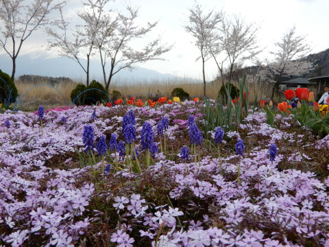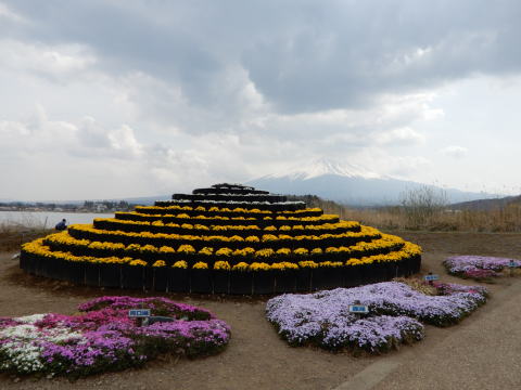 花壇の前に富士五湖が |