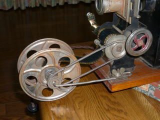 こちらには フライホイールとギヤがあります ギヤに付いているプーリーは 巻き取りドラムを駆動させる ために付いています |