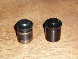 古いピストン(左)と新しいピストン(右) 新しいピストンとカップに ラバーグリスを薄く塗ります シリンダーにピストンを入れる際は ブリーダープラグを緩めておけば 入れやすいと思います |