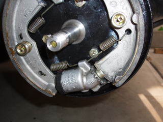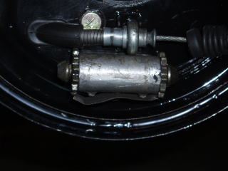 ワイヤーを取り付けます シューのピストンとアジャスターと あたるところに、ラバーグリスを塗ります シューをバックプレートに取り付けたら ライニングに軽くペーパーをかけて おきます |