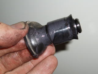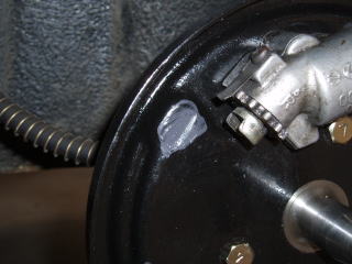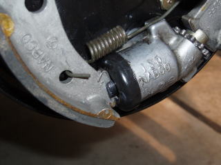 シューのアジャスターとピストンが 当たる部分もラバーグリスを塗ります 当たり面の広い方がアジャスター側 狭いほうがピストン側です |