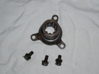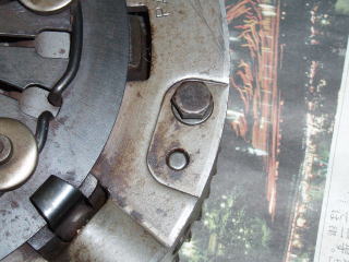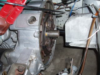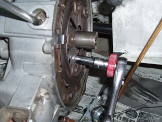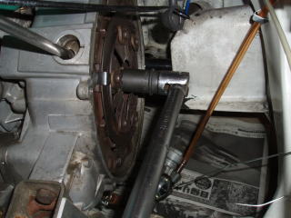 カバー部を外すと、 クラッチASSYが確認できます フライホイールの穴を利用して 回り止めします ソケットを使ってカップリングの ボルトを外します ★カップリングを外す前に、 取付位置の確認をしておきましょう |
