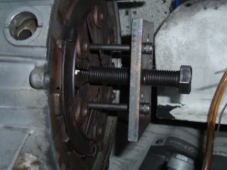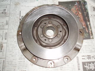 クラッチカバーのボルト6本を外し フライホイールとクラッチカバーを 分離します 分離するとクラッチディスクが 出てきます |