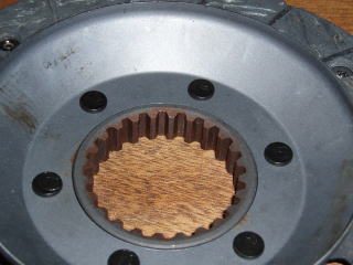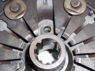 ダイアフラム式の場合は クラッチカバーのメーカー刻印 (左上の写真参照)と カップリングのスプラインが 切っていない部分(右上の写真参照) の位置を合わせます 左下の写真は、取外した カップリングです |