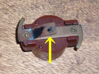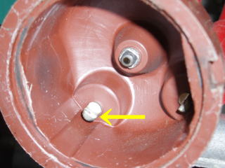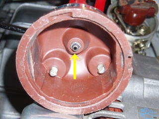 ポイントギャップの調整をすると 点火時期も狂ってしまうので調整が 必要です 調整は、デストリビューターの横にある 固定ボルトを緩めて、デストリビューターを 回転させて調整します 左に回すと、点火時期が早くなり 右に回すと、点火時期が遅くなります) |