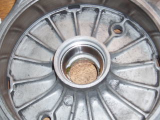 以降の作業は、ベアリング交換と 同じなので、写真は使い回しです ハブ内にベアリンググリス (MPグリス)を 入れておきます |