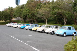 三崎公園にてランチ&記念撮影♪ 14台のスバル360が並びます! |