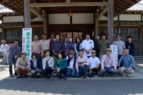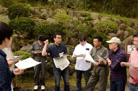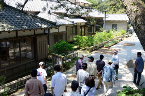建物や庭園の説明に聞き入る面々 |