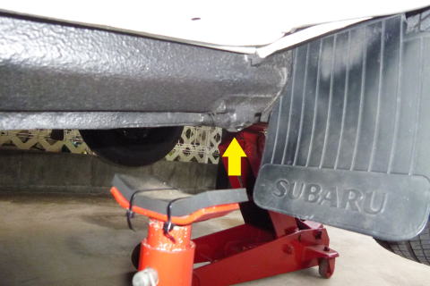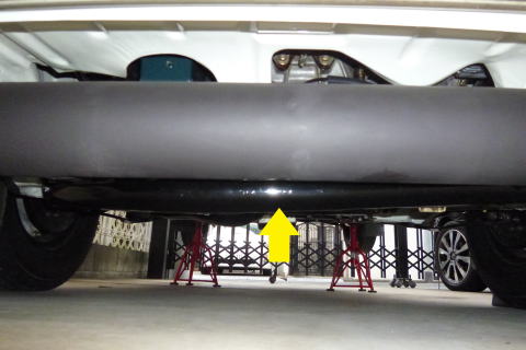 ジャッキアップをする際は 車止めをしてから始めましょう 黄色の矢印のところに ガレージジャッキを当てますが そのまま当てると車両が破損します ので、板などを併用してください 当てる位置は、トンネル下の プレートのあたりを目安にします |