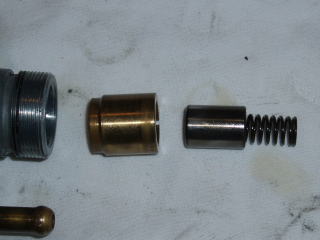 プランジャーを外します ほとんどのポンプで動きが渋くなって いると思います きつい場合は、バイスにポンプを 固定して、径のあったシャフト等を 使用してシリンダー等に傷を つけないように少しづつ 叩きながら注意して外します |