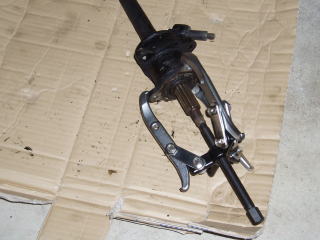 車載状態で作業する場合は ブレーキ回り、ショック及び サスアーム等を外しておきます 汎用プーラーをつかって シャフトを抜きます |