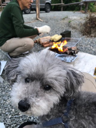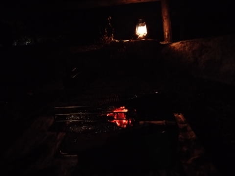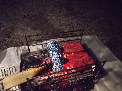 オイルランタンの灯りに癒されます 焚き火台では焼き芋を製造中 |
